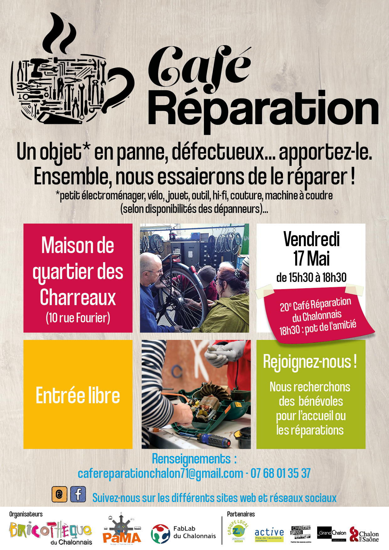 Vous souhaitez rejoindre l’équipe des bénévoles que ce soit pour l’accueil ou les réparations ? Prenez contact avec nous par téléphone ou mail !